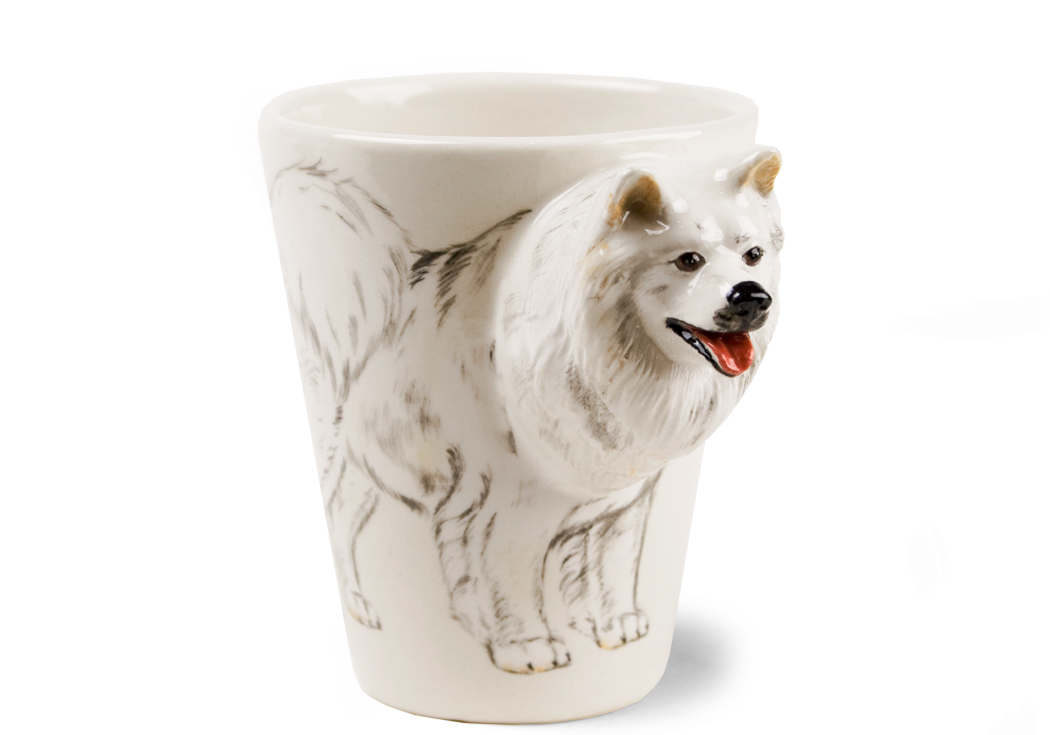 Originating in Russia, where it was bred for guarding and reindeer herding. The Samoyed is shown here on this Blue Witch ceramic, known to be an active dog, which enjoys human company.