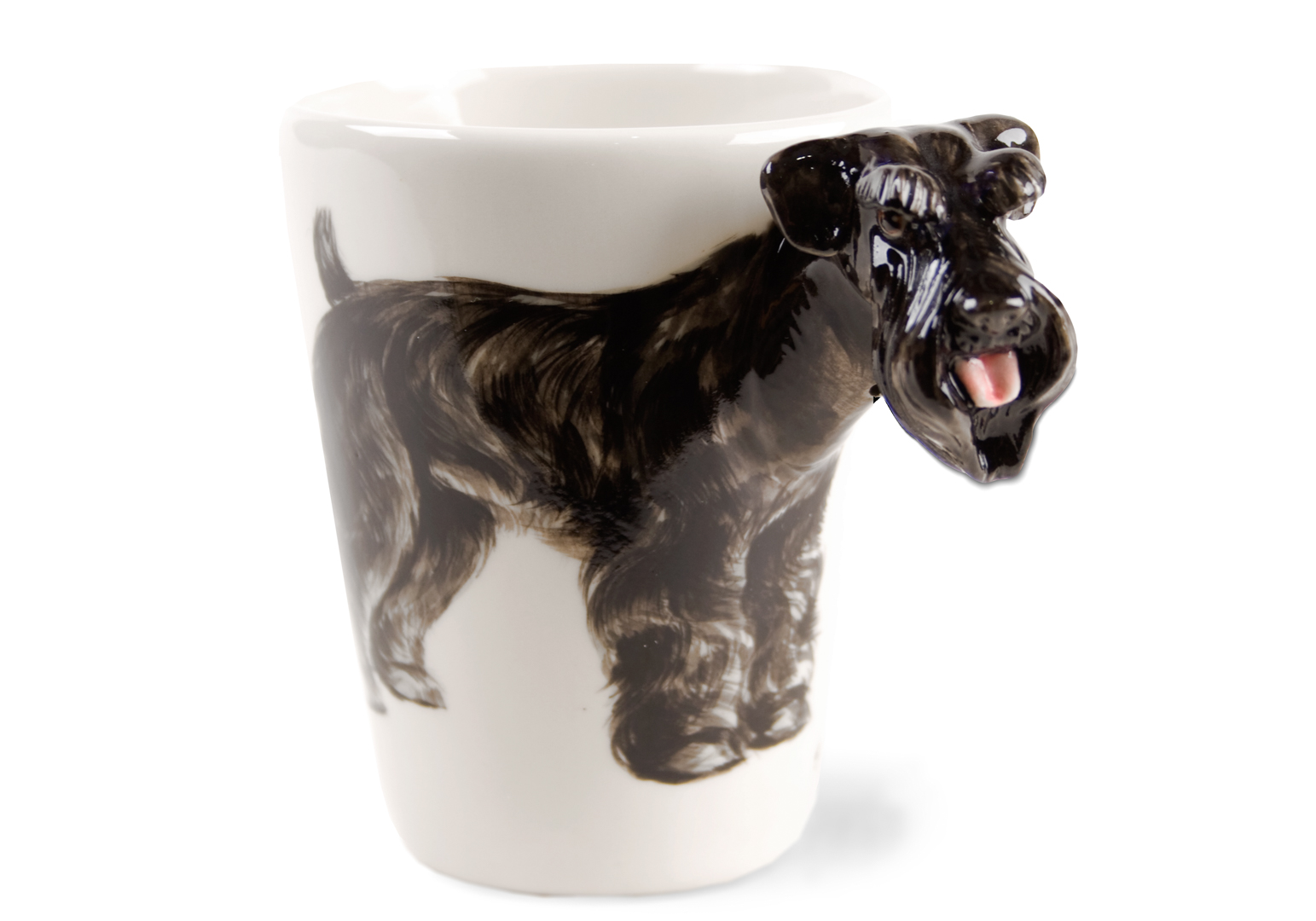 Featured here on this Blue Witch ceramic is the one and only, unmistakable Schnauzer. It has a unique and smartly distinctive look, with its compact, square build and beard. This adorable dog has its ancestral roots in the old guarding and herding dogs of Europe.