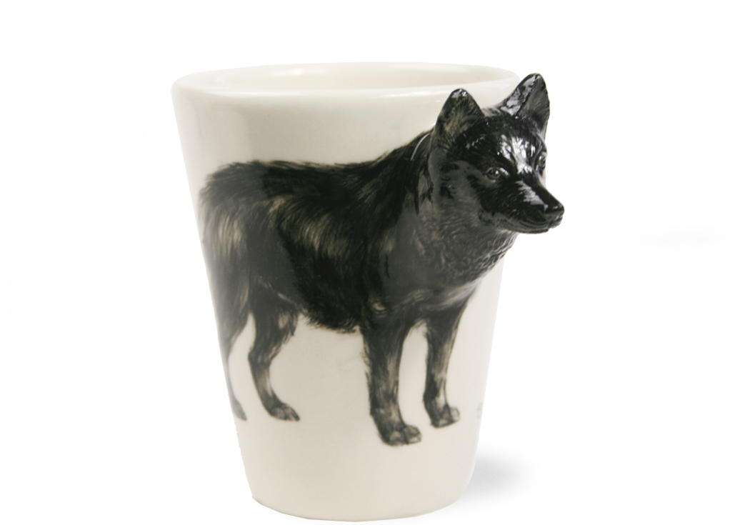 This stubborn little animal is featured here on a Blue Witch ceramic. The Schipperke is a small Belgian breed of dog with a mischievous and headstrong temperament which is sometimes referred to as the "little black devil" or "little black fox".